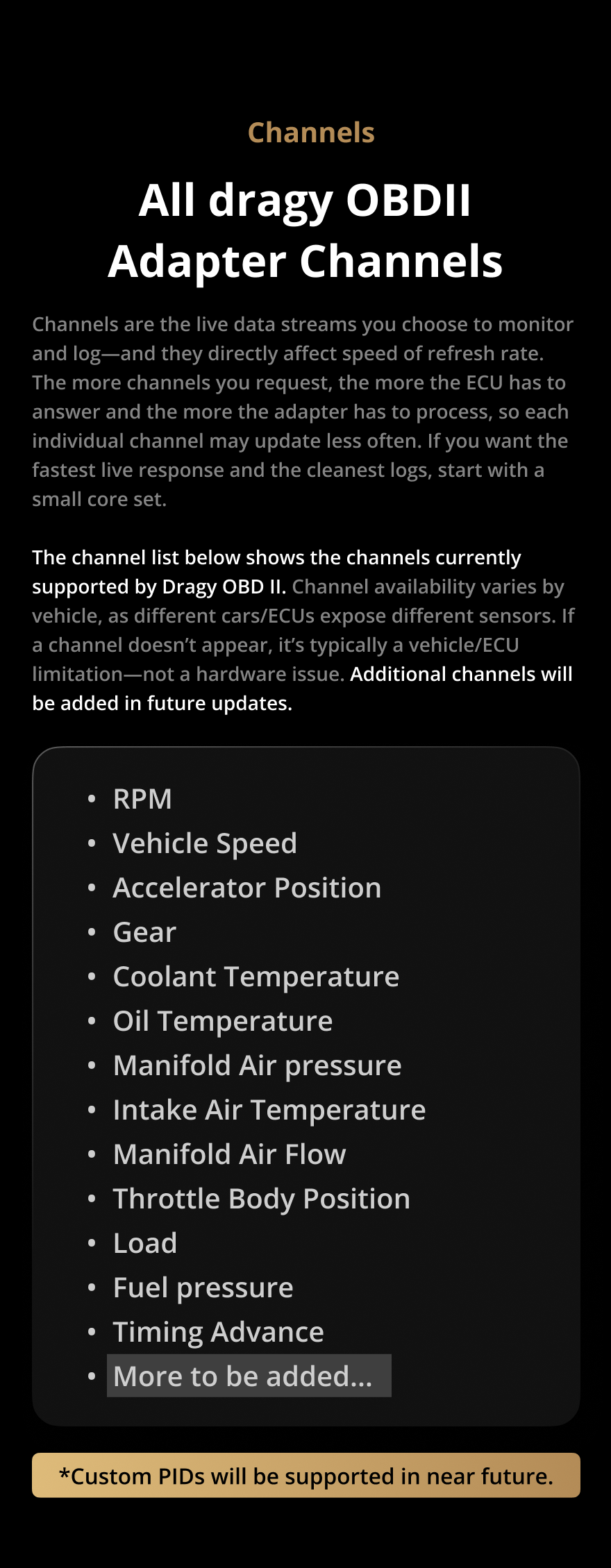 Most conventional OBD II adapters using standard CAN over Bluetooth hit a hard limit: even decent units only manage around 20–30 Hz total, shared across all channels. For example, if you log above 10 channels with a 30Hz high-end OBD II adapter on the market, each channel you chose can drop to under 3 Hz — far too slow for Dragy users who need true high-refresh performance. Dragy’s OBD II adapter fixes this with proprietary tech, a high-performance processor, and advanced CAN hardware, massively increasing communication speed through the standard OBD protocol so that on many vehicles you can run up to 10 channels at around 10 Hz per channel, with peak refresh rates up to 400 Hz. It’s not a small upgrade — it’s a step-change in speed and reliability.