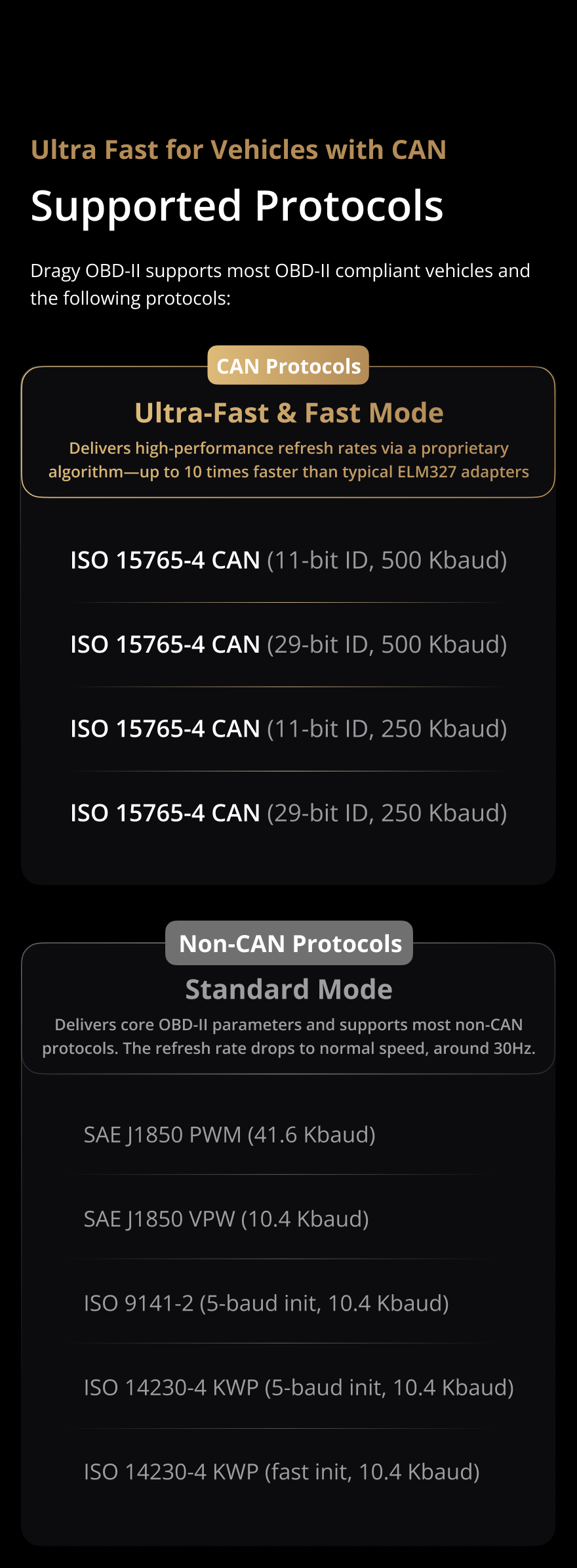 Dragy OBD II adapter is optimized for CAN-protocol vehicles and is highly recommended for cars that use the CAN protocol. Non-CAN vehicles are still supported with standard speed depending on the protocol.